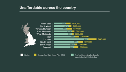 | Region | Average New Build House Price (ONS) | % of working renting families who cannot afford | % who cannot afford with Help to Buy | |